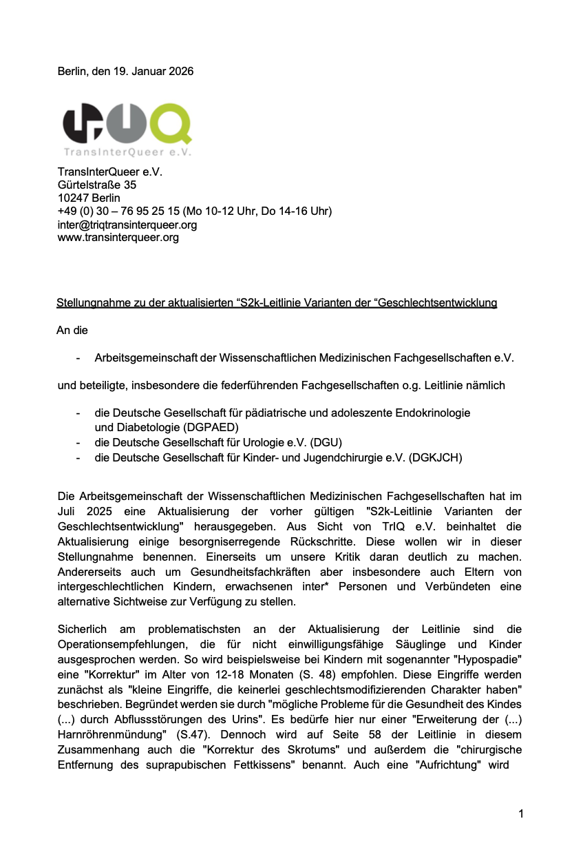 Aus Sicht von TrIQ wiesen sowohl der damalige Entwurf als auch die inzwischen im November 2025 veröffentlichte finale Fassung der Leitlinien erhebliche Mängel auf und lassen einen besorgniserregenden Kurswechsel im Hinblick auf den Schutz intergeschlechtlicher Kinder vor Menschenrechtsverletzungen erkennen. Wie angekündigt wurden die Kritikpunkte in einer schriftlichen Stellungnahme festgehalten. Diese Stellungnahme wurde von zahlreichen Organisationen und Einzelpersonen mitgezeichnet und wird nun an dieser Stelle veröffentlicht.